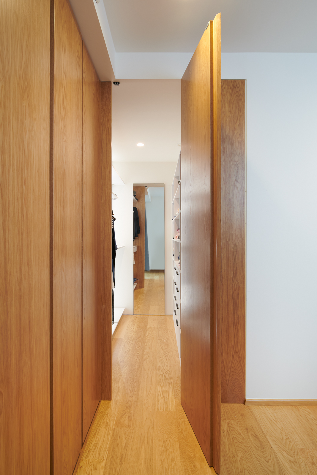 Všimněte si zajímavého detailu dveří, které jsou bez úchytek. Šatní skříň i dveře do šatny jsou vyrobeny ve stejném designu tak, aby dokonale ladily s interiérem.
