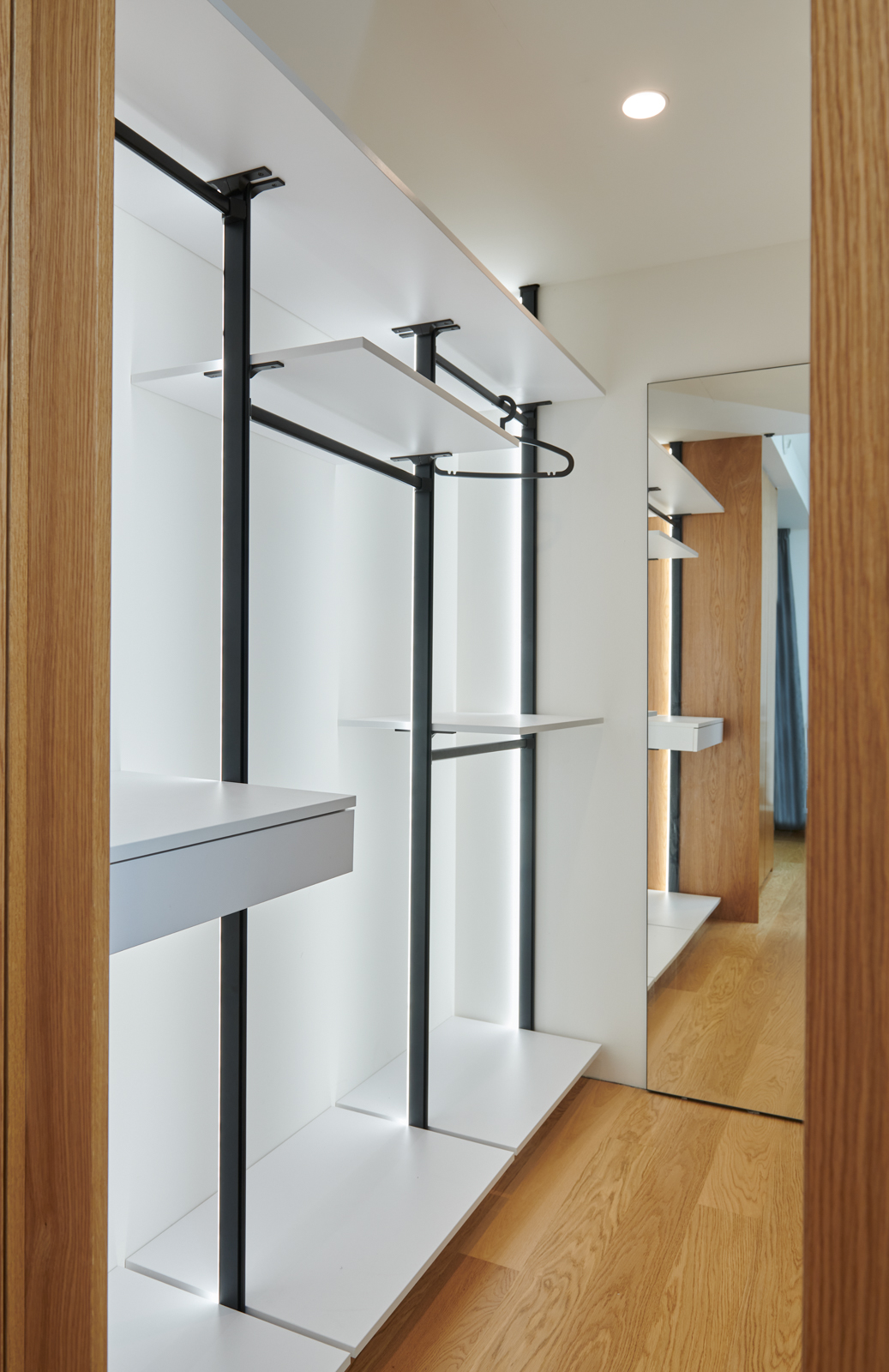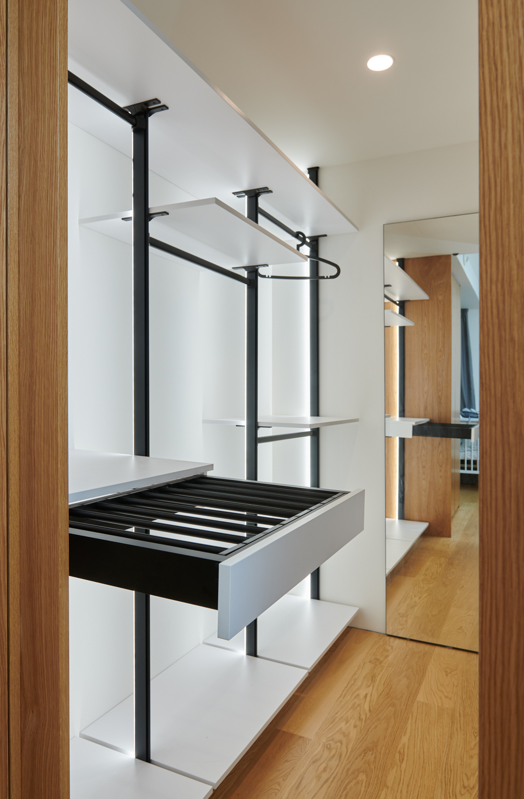 Pravou část rohu jsme vyplnili dveřmi, které skrývají příjemnou a vzdušnou šatnu s lehkou konstrukcí šatního systému SLIM. Na malý a úzký prostor se vešlo několik kombinací zásuvek, skříněk i šatních tyčí s LED osvětlením.