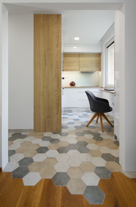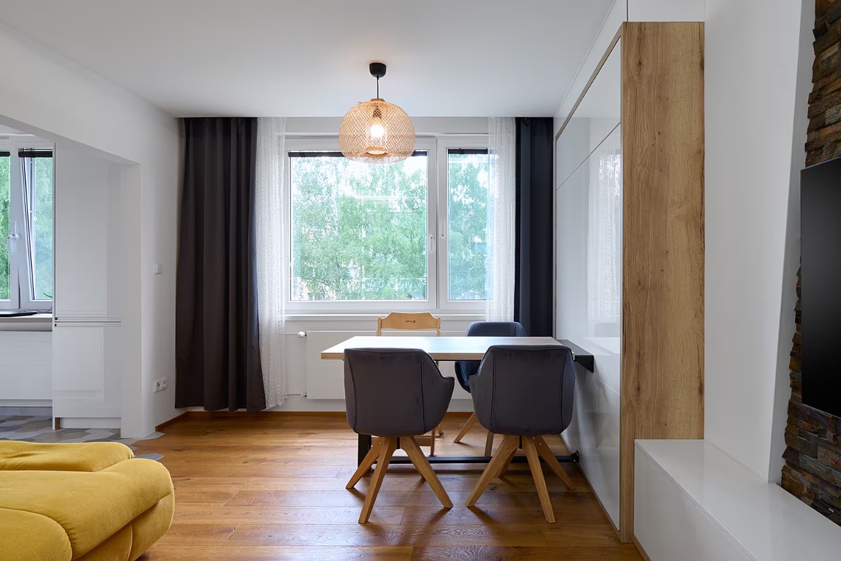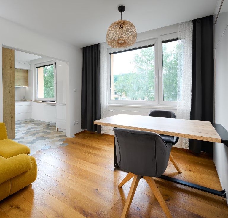 Jídelní stůl se do úzké kuchyně nevešel. Podlaha z masivního dřeva příjemně kontrastuje s lesklou plochou stěny za stolem. Barevně s ní ladí obklad za televizorem. Designéři Woodface zajímavě pojali propojení dřevěné podlahy s keramickou dlažbou použitou v chodbě a kuchyni. Široký průchod z obývacího pokoje do chodby a kuchyně celý prostor opticky zvětšuje.
