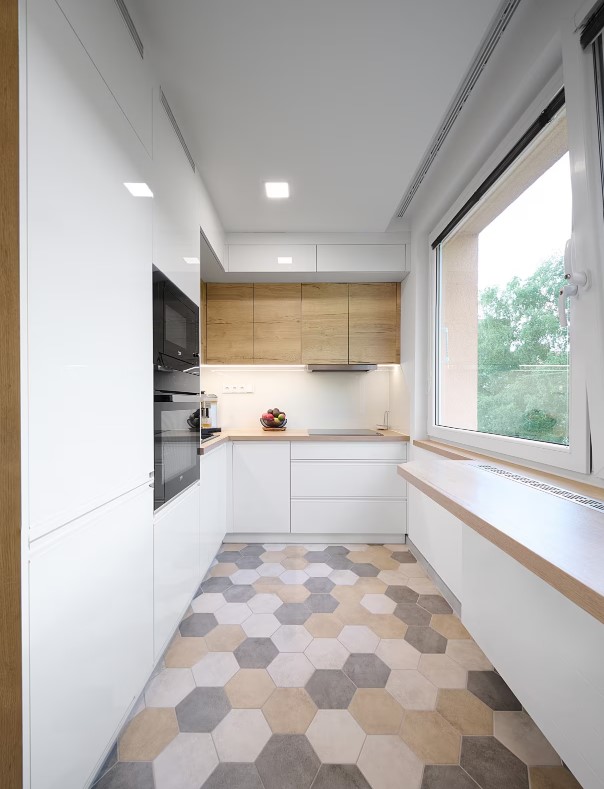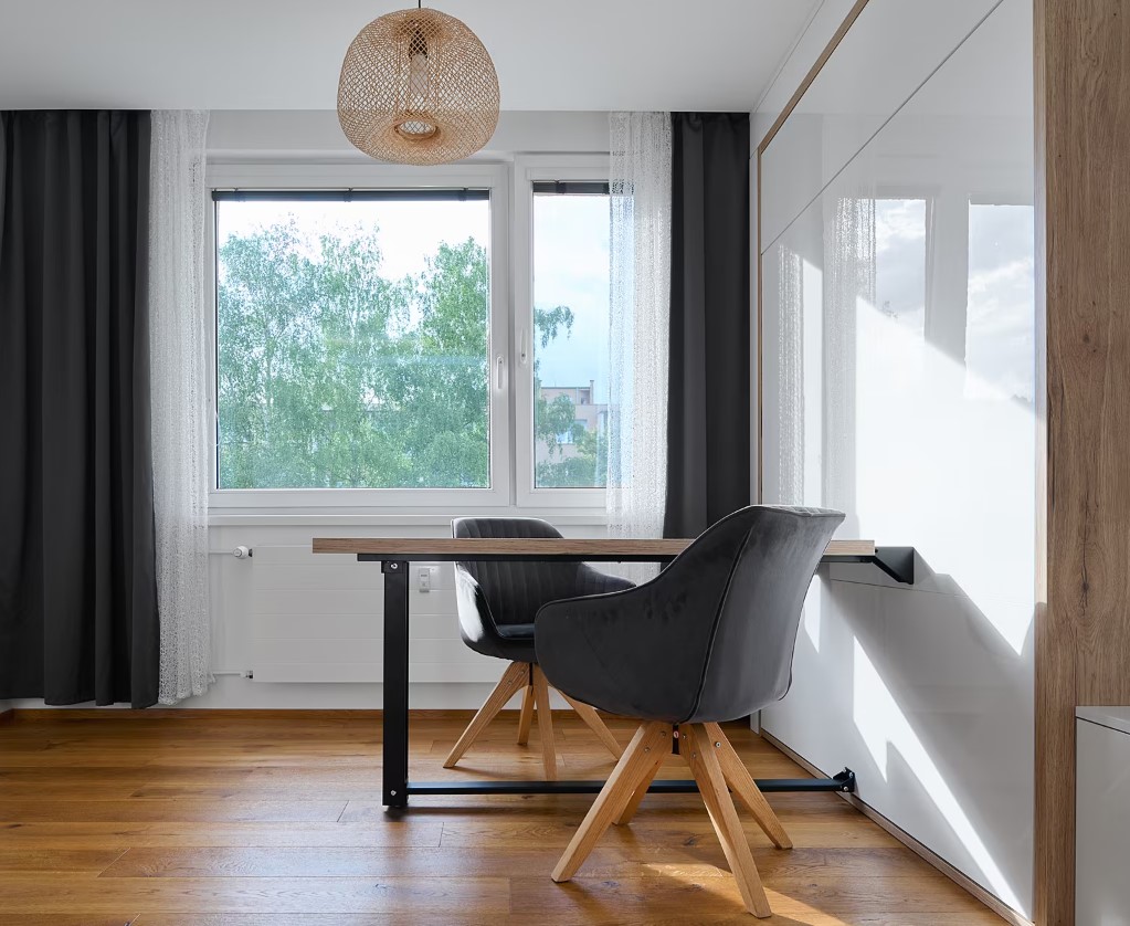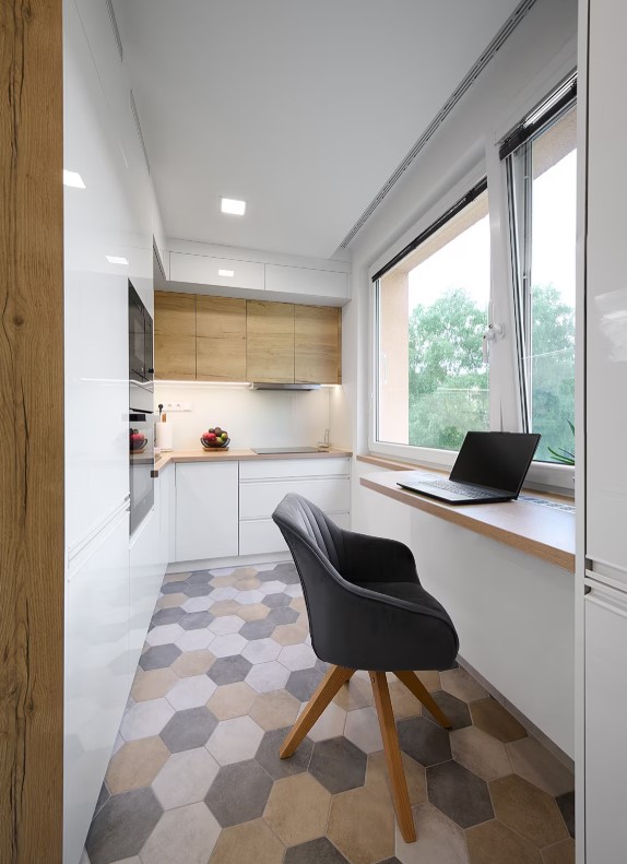 Pomyslným srdcem bytu dnes bývá kuchyň propojená s obývacím pokojem. V případě tohoto malého bytu 2+1 je prostor kuchyně hlavně funkční, splňuje nejpřísnější požadavky na vaření a pracovní plochu. Dokonce se zde podařilo vytvořit i malý prostor pro home office v případě nutnosti práce na PC z domova. Prostě zavřete dveře do kuchyně a máte klid.