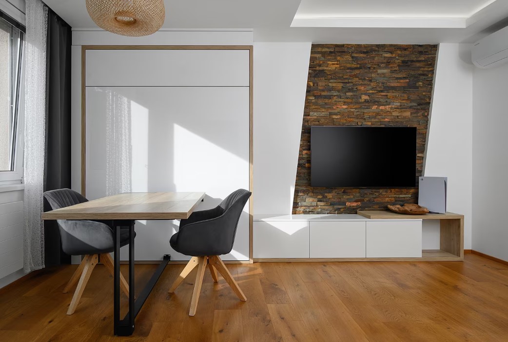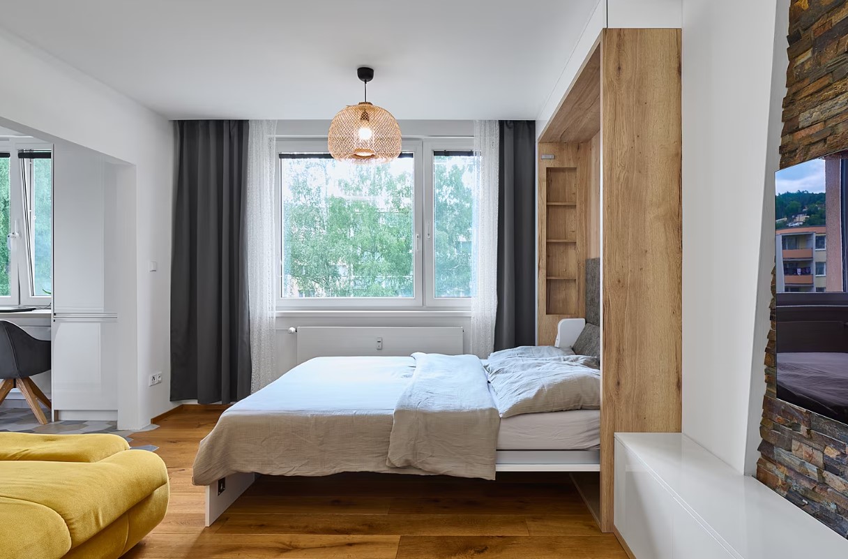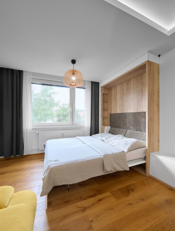 Obývací pokoj je v podstatě klasicky zařízený, s pohodlnou sedačkou, moderní TV a minimalistickou sestavou pod ní. Velké plus představuje krásná podlaha z masivního dřeva. Pohodlná manželská postel o šířce 180 cm se skrývá za jídelním stolem, na noc stačí stisknout tlačítko elektrického ovládání a lůžko je hned po ruce, stůl se jednoduše „složí“ pod postel. Vše do sebe zapadá a tvoří jednotný celek.