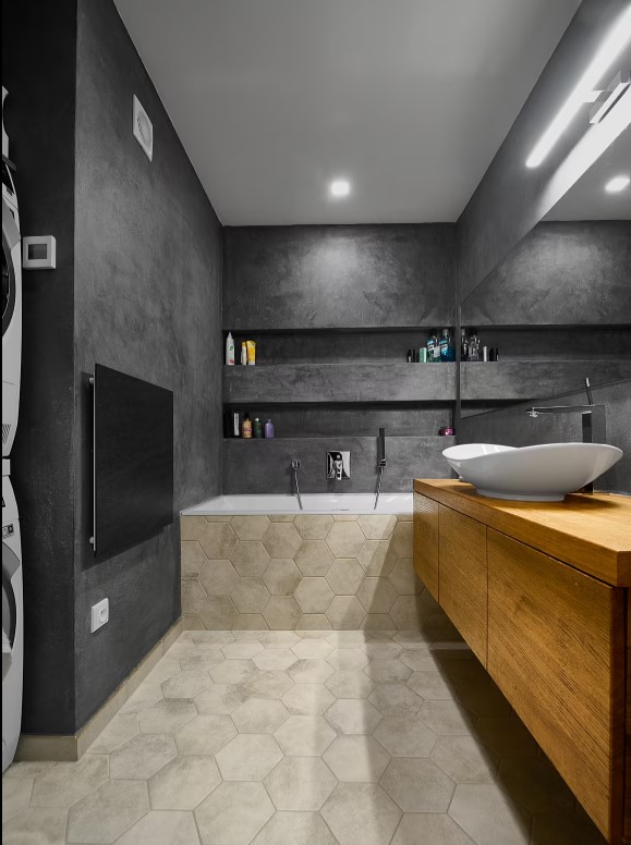 Na panelákové bydlení působí koupelna s přírodními materiály hodně luxusně, podařilo se do ní umístit dokonce pračku se sušičkou. I kvůli dítěti volili majitelé tradiční vanu místo dnes tolik používaného sprchového koutu.
