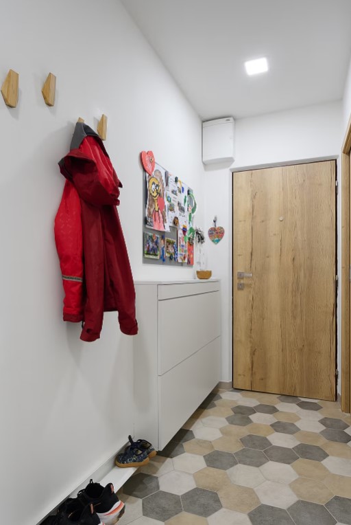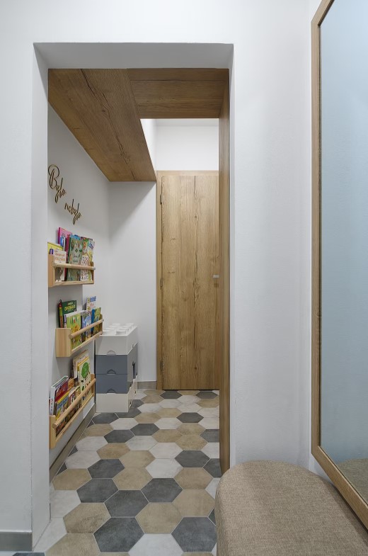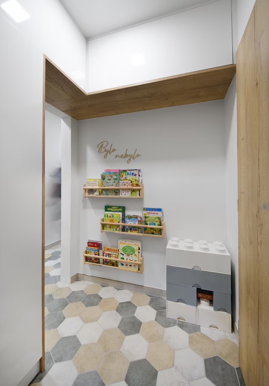 Aby malý pokoj, původně společná ložnice rodičů a dítěte, mohl být využitý pro hrací a životní prostor potomka, umístili designéři úložné prostory i do prostoru před vchodem do pokoje. Podařil se jim téměř zázrak, ačkoli úzkou předsíň využili do posledního centimetru, přesto nepůsobí stísněně.