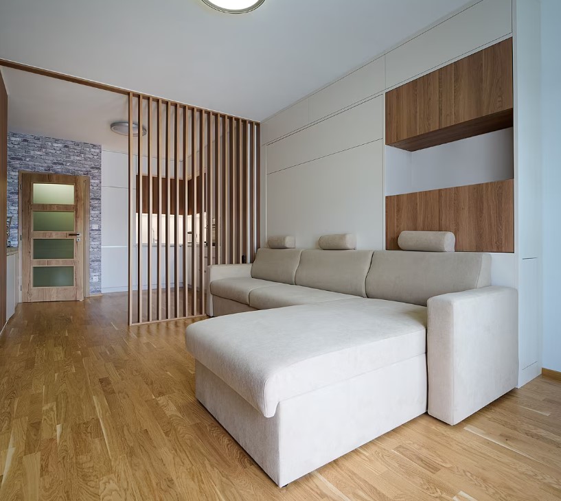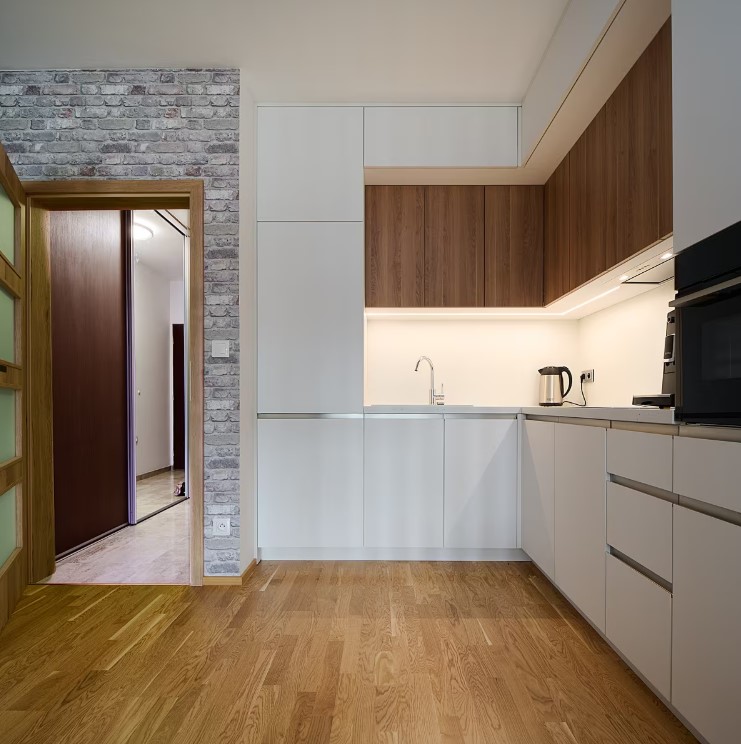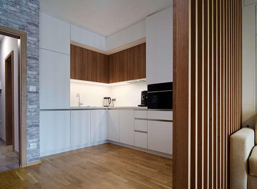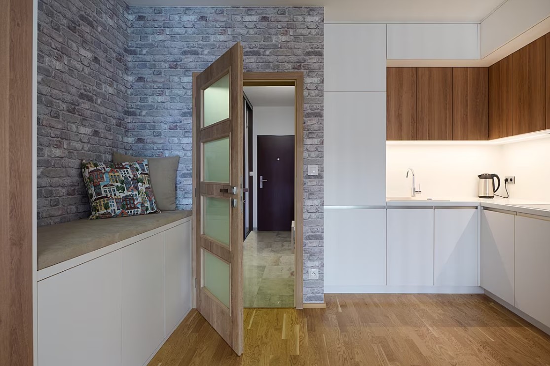 Designéři z našeho studia Woodface navrhli nábytek na míru tak, aby byl nadčasový, světlé barvy pomáhají prostor garsonky opticky zvětšit. Vzdušná lamelová příčka odděluje „obývací pokoj“ od „kuchyně“.