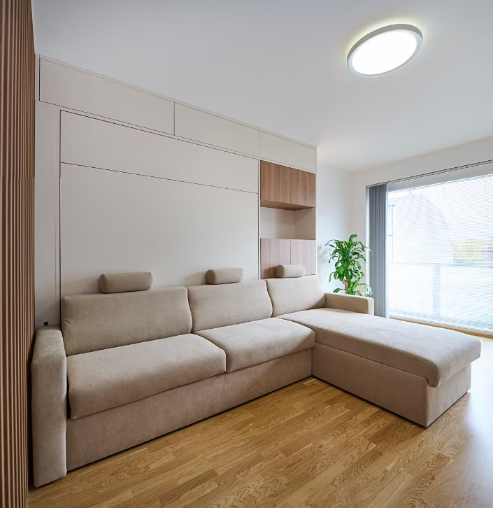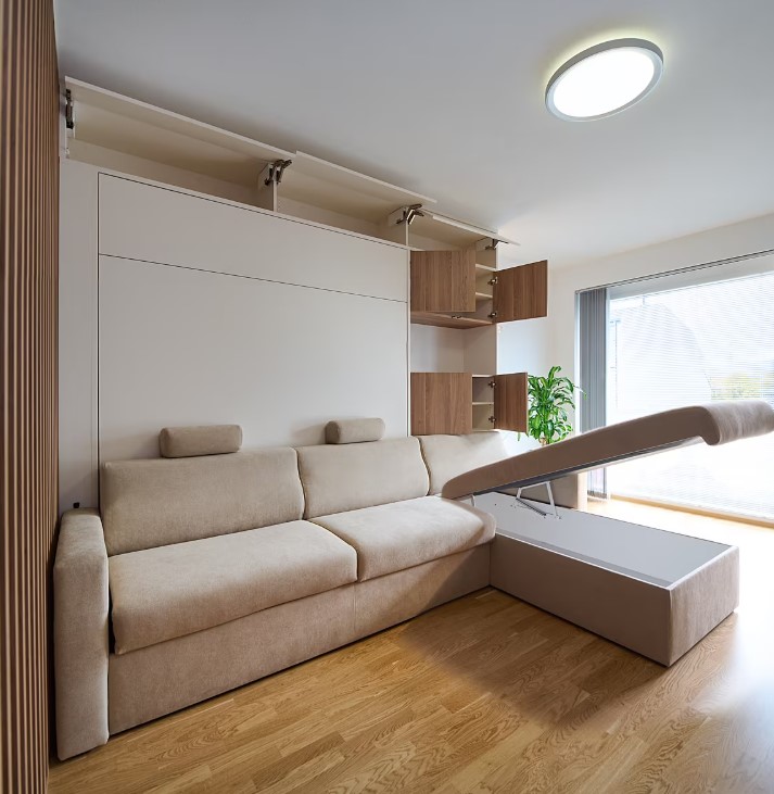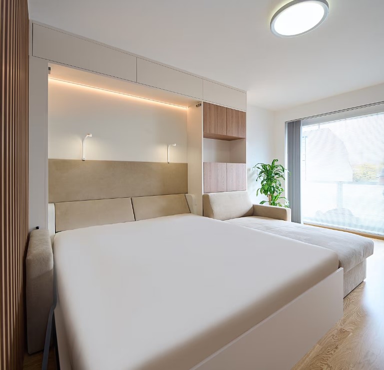Díky motorickému vyklápění postele na dálkové ovládání je přeměna obývacího pokoje na ložnici hračkou.