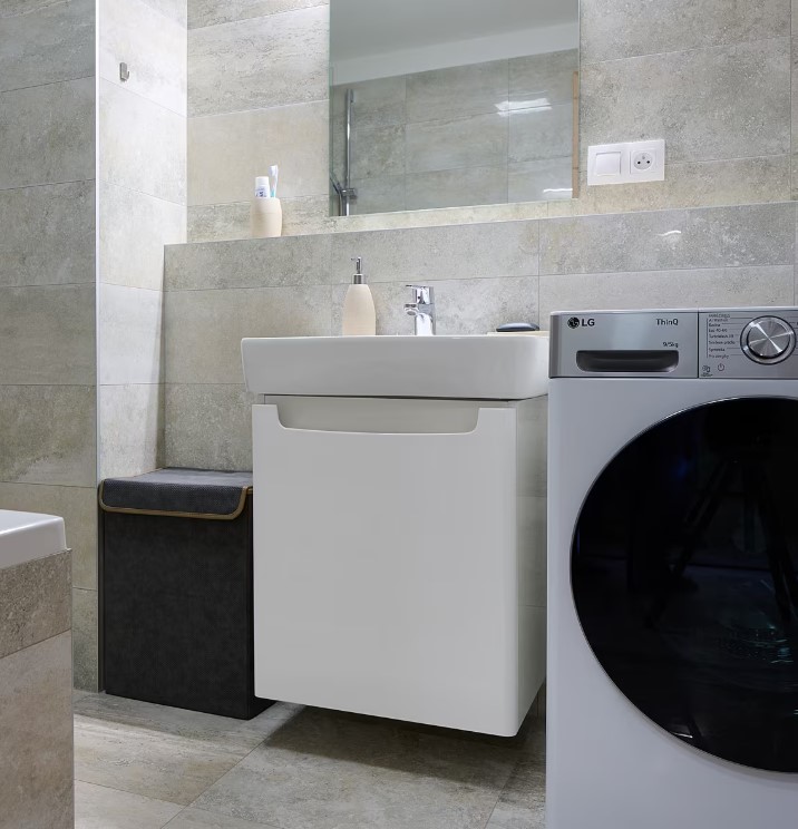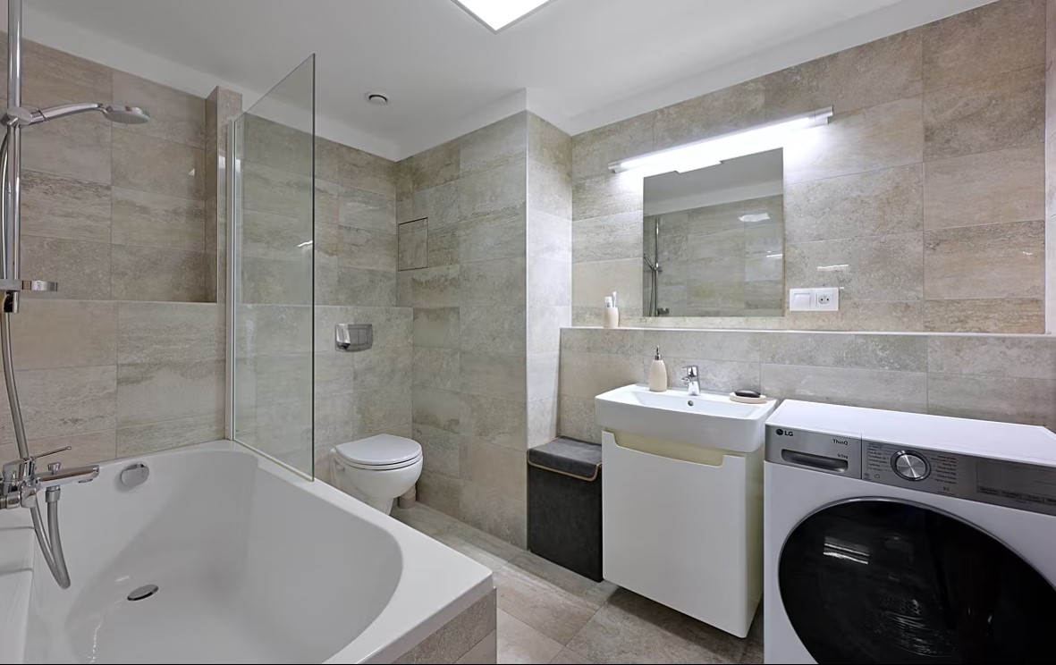 Velká koupelna s vanou je zařízena minimalisticky, Jediný kus nábytku je malá skříňka pod umyvadlem v povrchové úpravě lesklý lak. Do koupelen se rozhodně nedoporučuje nábytek z levného lamina, který rychle nasákne vlhkost a celý se začne rozpadat. Tady je vyšší investice rozhodně na místě.