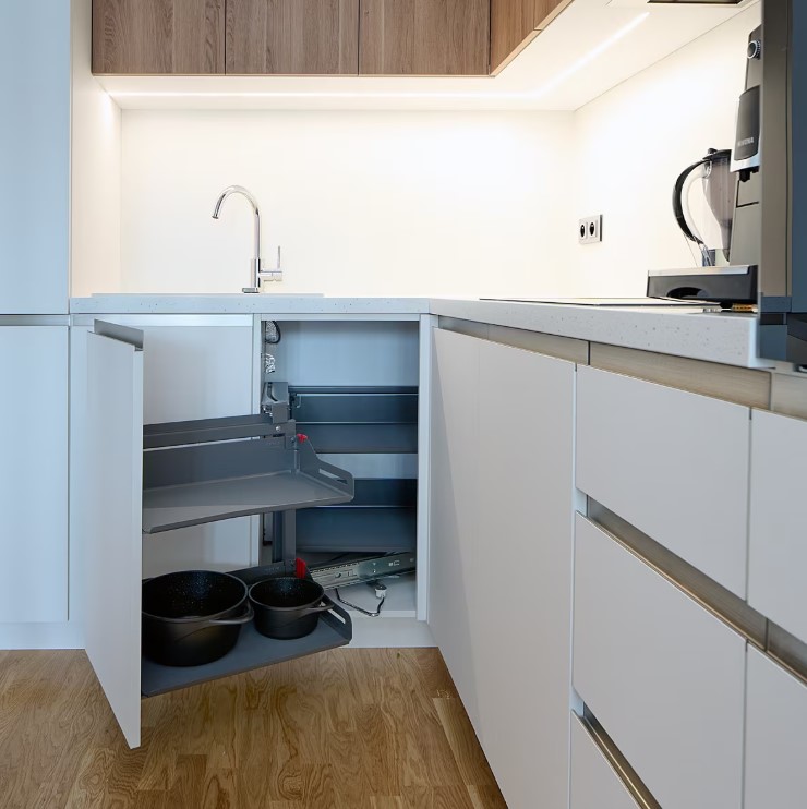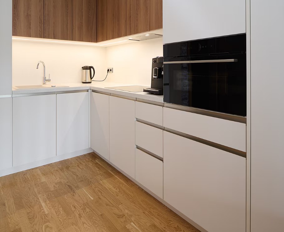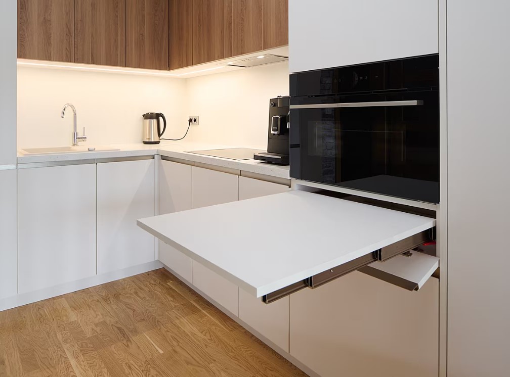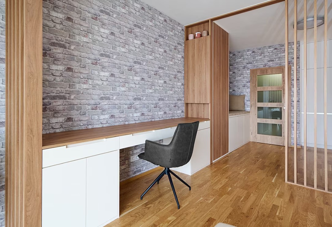 Velký pracovní stůl umožňuje jakoukoliv práci z domova. Boční části pod stolem jsou využity jako úložné prostory. Malá kuchyň je plně vybavena všemi potřebnými spotřebiči pro vaření, nechybí ani myčka. V případě nutnosti lze zvětšit pracovní plochu kuchyňské desky jednoduše vysunutím další část potřebné plochy, ta může posloužit třeba i jako snídaňový stolek. Když není potřeba, „zmizí“… Kuchyňská linka využívá prostor až ke stropu. Plocha pro ležení na nízké komodě poslouží k relaxu a vzájemné pohodové komunikaci mezi partnery při přípravě obědu či večeře. Každé místo kuchyně je využito – tomu slouží i rohový výsuvný mechanismus.