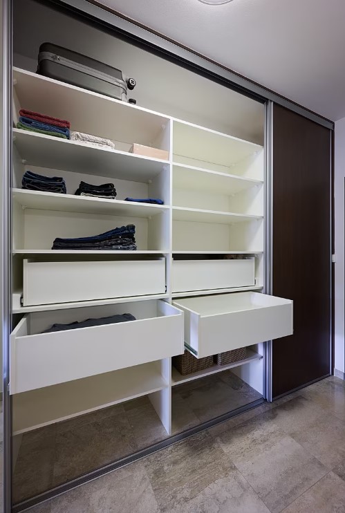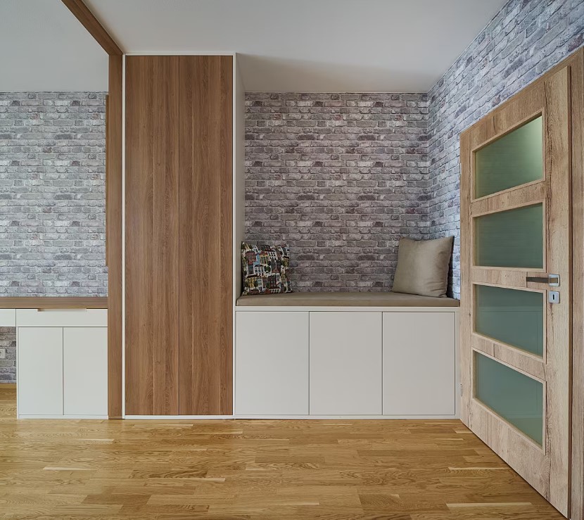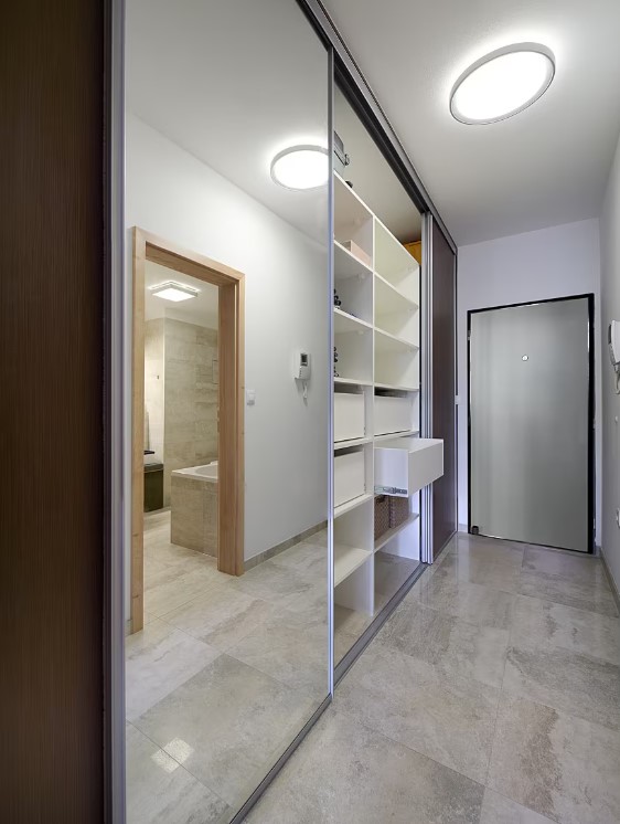 V předsíni byl kladen důraz spíše na funkčnost a úložné prostory nežli na design. Předsíň zařízená klasickou šatní skříní s posuvnými dveřmi.