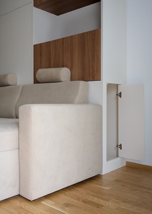 Velká pohodlná sedačka s lenoškou je dominantou prostoru. Ta skrývá velký úložný prostor. Veškeré vybavení garsonky (i část bytu) se uhradilo ze stavebního spoření, které rodiče synovi platili. Prostor v nábytku za lenoškou je přístupný z boku, aby se vyžily všechny možnosti pro skryté ukládání věcí.